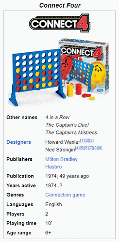 There are people who still do not know or have never played the well-known board game "connect four" by Milton Bradley (February 1974), although I assume they are few: the well-known board game in which a player can win by placing his pieces from top to bottom on a board arranged vertically on a horizontal plane and forming groups of 4 consecutive elements horizontally, vertically or diagonally.